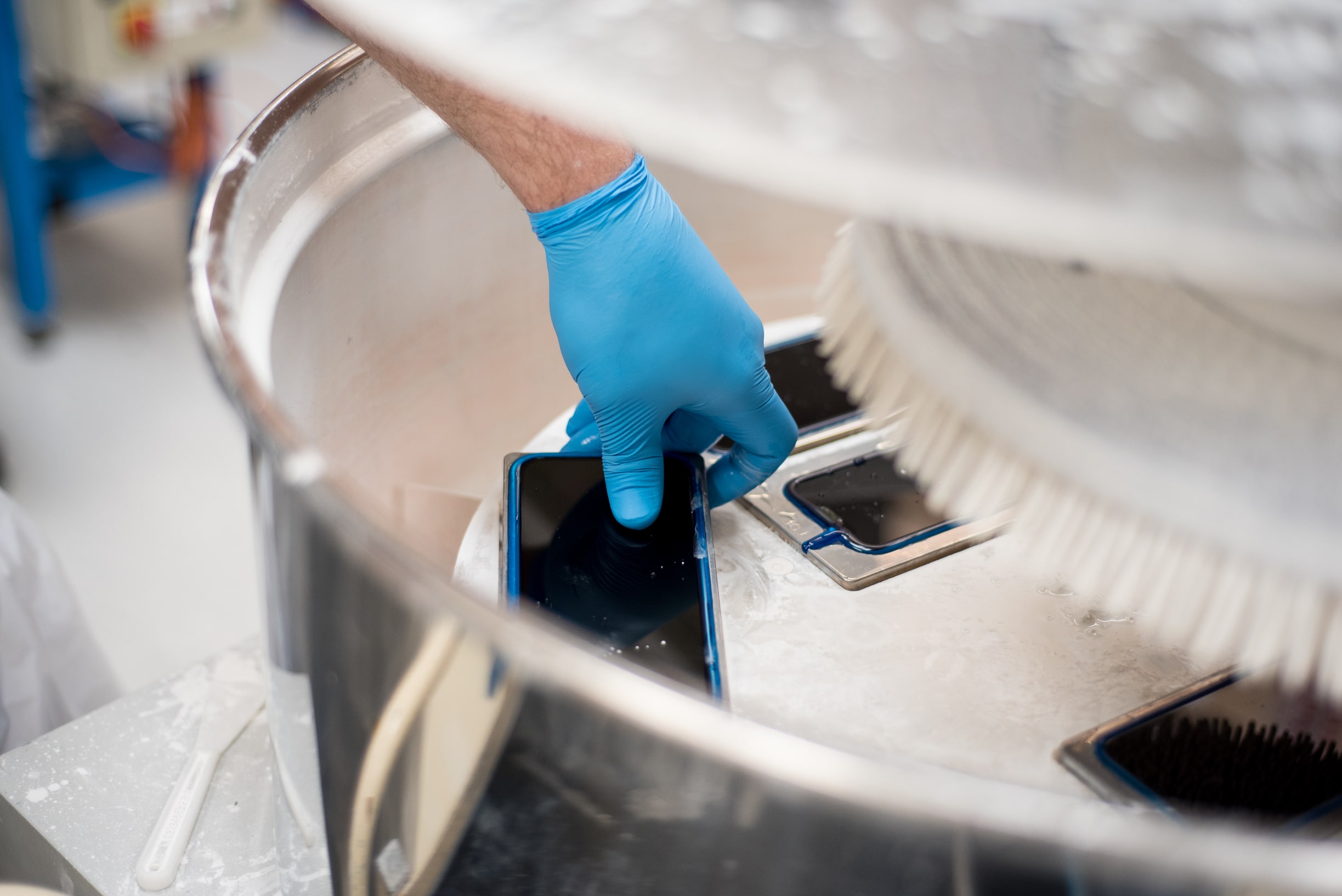 Assessed and suitable devices are put into custom-built, device-specific jigs which are loaded into the application machine. The jigs are made watertight with a sealant using model-specific calibrated software and cured under UV. The integrity of the seal is checked using a high magnification dyno scope.